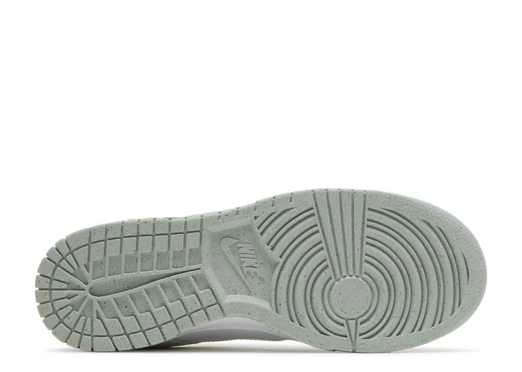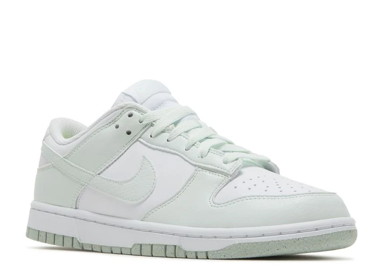 The Nike women’s Dunk Low Next Nature 'White Mint' combines a pastel two-tone palette with a sustainable build made with at least 20% recycled materials by weight. The synthetic leather upper features a pristine white base with lightly textured forefoot and heel overlays in a pale mint green hue. Standard Nike branding lands on the woven tongue tag and leather heel tab, while the Volt-colored mesh sockliner is stamped with Nike’s retro pinwheel logo.
